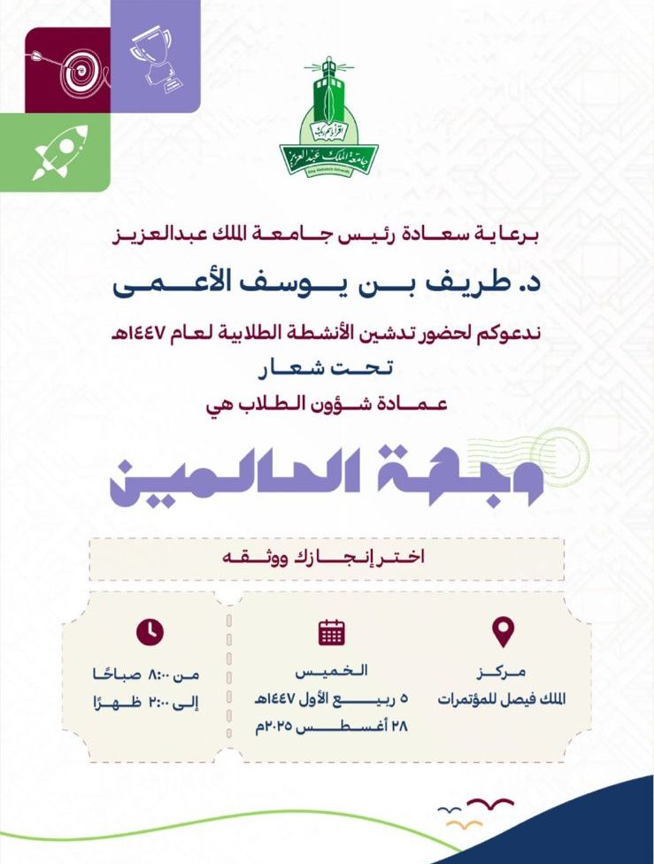 King Abdulaziz University invites its students to participate in the student activities for the academic year 1447 AH under the theme "Destination of Dreamers," officially launching on Thursday, August 28, 2025, at the King Faisal Conference Center, under the patronage of the University President, Dr. Tarif bin Youssef Al-Ama.